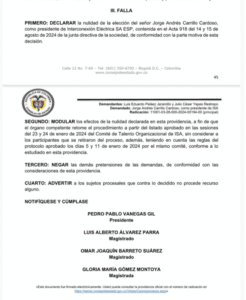 El Consejo de Estado anuló la elección de Jorge Andrés Carrillo Cardoso como presidente de Interconexión Eléctrica S.A. (ISA), tras fallar a favor de la demanda presentada por el diputado antioqueño Luis Eduardo Peláez Jaramillo, quien cuestionó la legalidad del proceso de nombramiento.